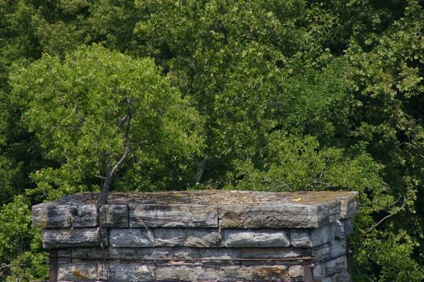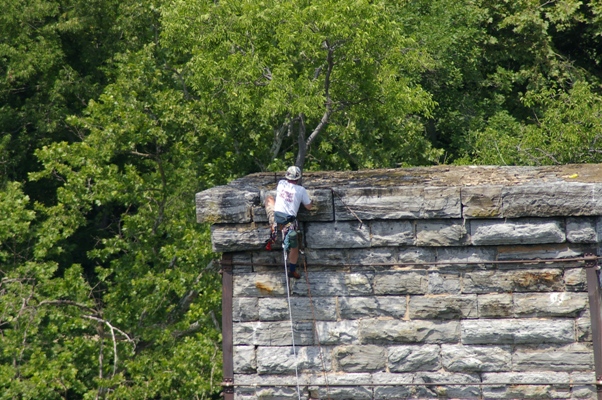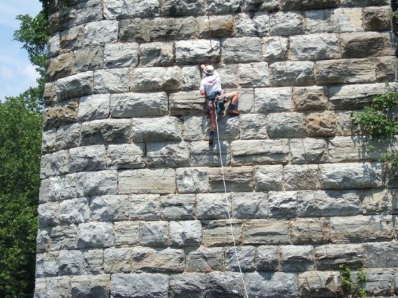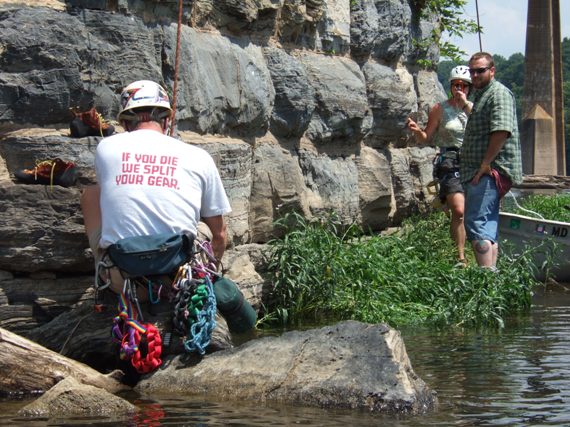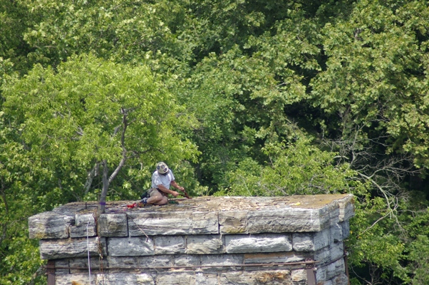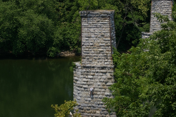 Originally I was going to climb up the Maryland side of the tower. The tower leans *ever* so slightly towards WV, so I thought it would be good to take every advantage I could while going up. ;-) Plus there were places to stand on the MD side and stay dry; not so much really on the WV side. Alas, as we were once again attempting to rig the lines (and *almost* got the anchor line over - except the knots in the rope managed to slip into a crack and...well, held fast :-( ). Between that and the trees growing out from the side of the tower on the MD side, and the tree growing out from atop of the tower, we decided to pull the rope from the other side of the tower and set the top-rope up to climb up the WV face.