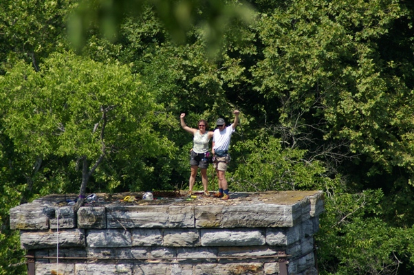 I quickly got myself secured and went off belay. I then secured Gayle's rope and posed for a few pictures with the cache for the overlook party. I also found Snurt's arrow, buried to the nock in a crack in the mortar in the tower. I retrieved it to give back to him later. I then put Gayle on belay while she worked up her static line using a jumar ascender and a grigri configuration. In a few minutes she, too, was on top of the tower. The second person to make it up and stand there proudly!