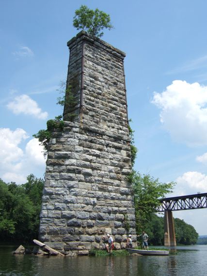 Located in the Potomac River just outside of Sherpherdstown, WV, stand three rather tall (~70') pillars, the remnants of an old railroad bridge that was washed away in a flood some decades ago. The pillars themselves were erected in the 1830s and have literally stood the test of time. Sept of 2006, an extreme geocacher named Vinny planted a geocache atop the center-most pillar in the center of the river. It was published as "Psycho Urban Cache #13 - Impossible! Give Up Now!" (it was the 13th in a series of extreme geocaches he's placed, and was by far the hardest one he had placed). It quickly became affectionately known as PUC13 (among other names) in the geocaching community. And has been labelled as one of the most difficult geocaches to date (mostly in the "getting to it" bit, not the finding it; that part is easy, as you can see it from an overlook on the WV side of the river ;-) ).
