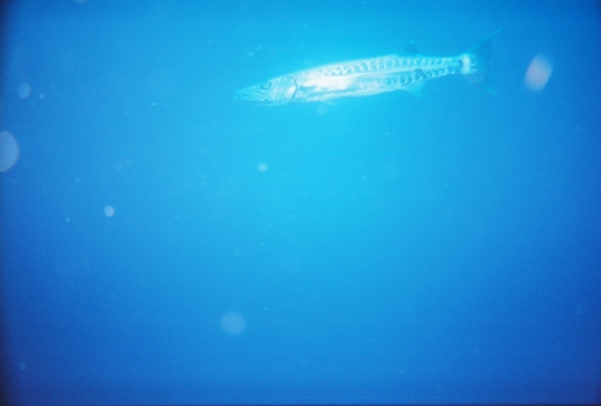 I paused at 40'. There, maybe 20' away was a large silver fish - the barracuda! Sweet! Didn't see the hammerhead, didn't see the sailfish, but at least I got to see the 'cuda. I snapped a photo (got him in it, though not very centered), and continued up to my safety stop. I hung out there a while, just taking in the last minutes of being in the ocean, burning my gas down to just under 500 psi (I started at 4000), then went up.