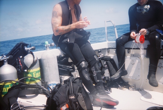 Loaded, we headed out. As the seas were all but flat (1' waves) we motored onward at 23 knots. Including the pee breaks, it took us just over 2 hours to get to our destination. I was in the water this time by 9:30a!