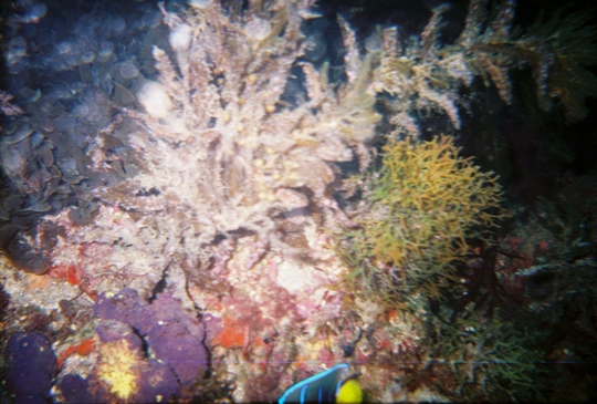 We continued underway. I managed to be okay until we got to the dive site. Then...twice more I got sick while others suited up and went in. They all told me, and I whole heartedly believed them, that getting down below the waves - or just even off the boat! - would help. But suiting up was....I can't describe the level of discomfort I was feeling due to being seasick and trying to get into a skin-tight wetsuit, put weights on, a heavy tank and BC (buoyancy control device), fins, and make sure I had everything in my diver's checklist noted. Combine this with the fact I was more or less going buddyless (Aaron and Garrett were already down) did nothing to make things easier. Add to this that this would be my first time going *backwards* from a sitting position into the water just increased my anxiety levels ("how far down below me is it?!?!? 2 feet???? I'm gonna die!!!!").