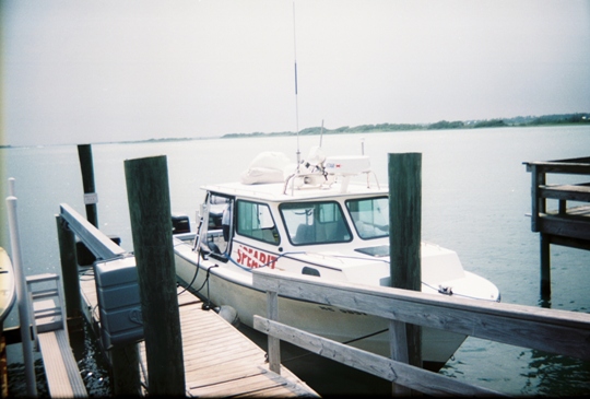 Morning came all too quickly. I had gotten 4 hours sleep total (woke up earlier than needed as well; still anxious). Got a shower ("why? you're going to be getting wet anyhow!" "this is my version of morning coffee! :-P " ), and started assembling our gear at the dock. Capt Tom and his weekday mate Alan were already there unloading the tanks and prepping the boat (Tom's usual weekend mate is a guy named Mark, but he had to be out of town this weekend for a family emergency, so Alan stepped up to bat...or dive, that is). Under cloudy skies we loaded up stuff onto the 25' twin 250 hp Yakima engine boat and headed on out.